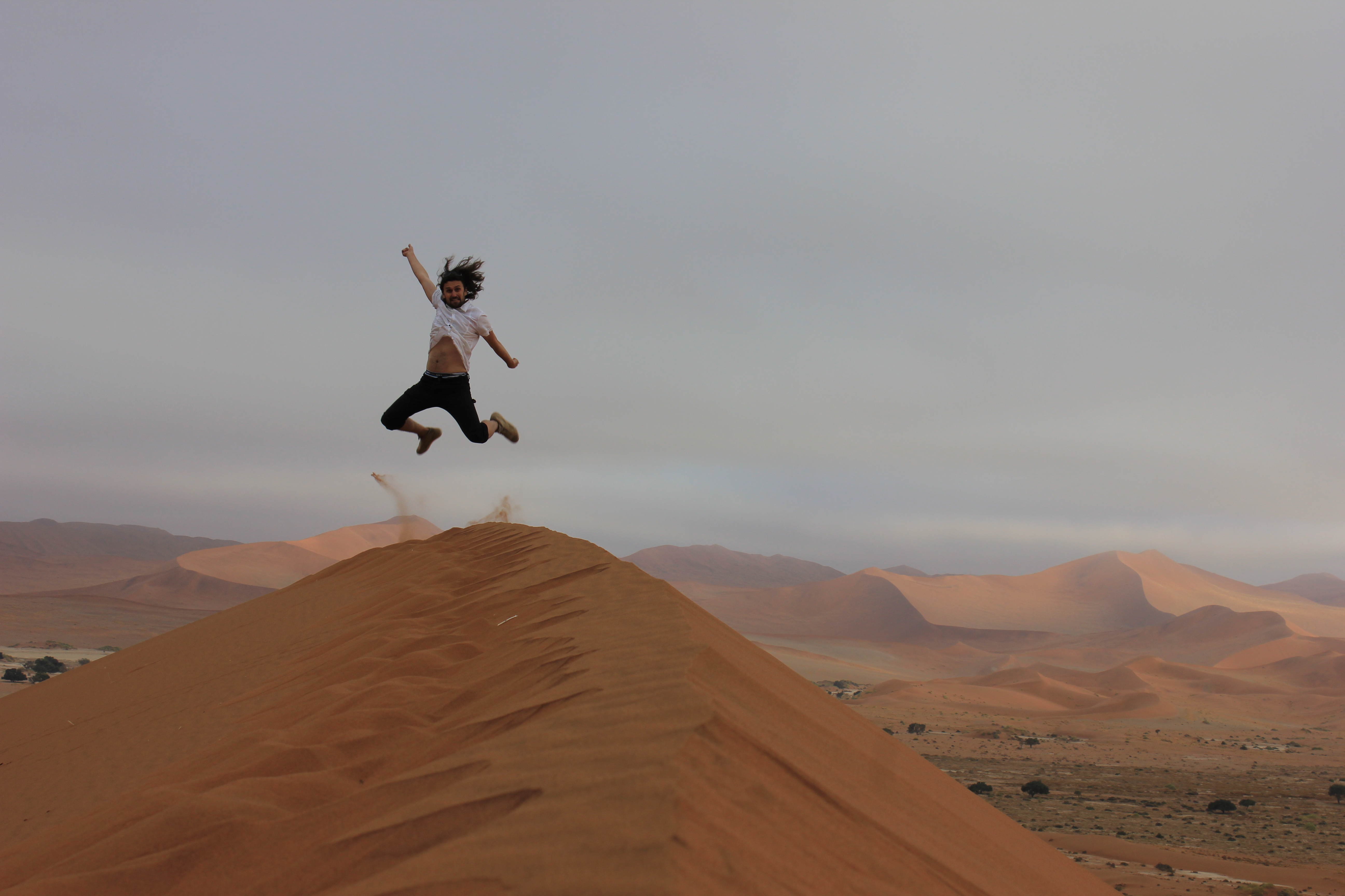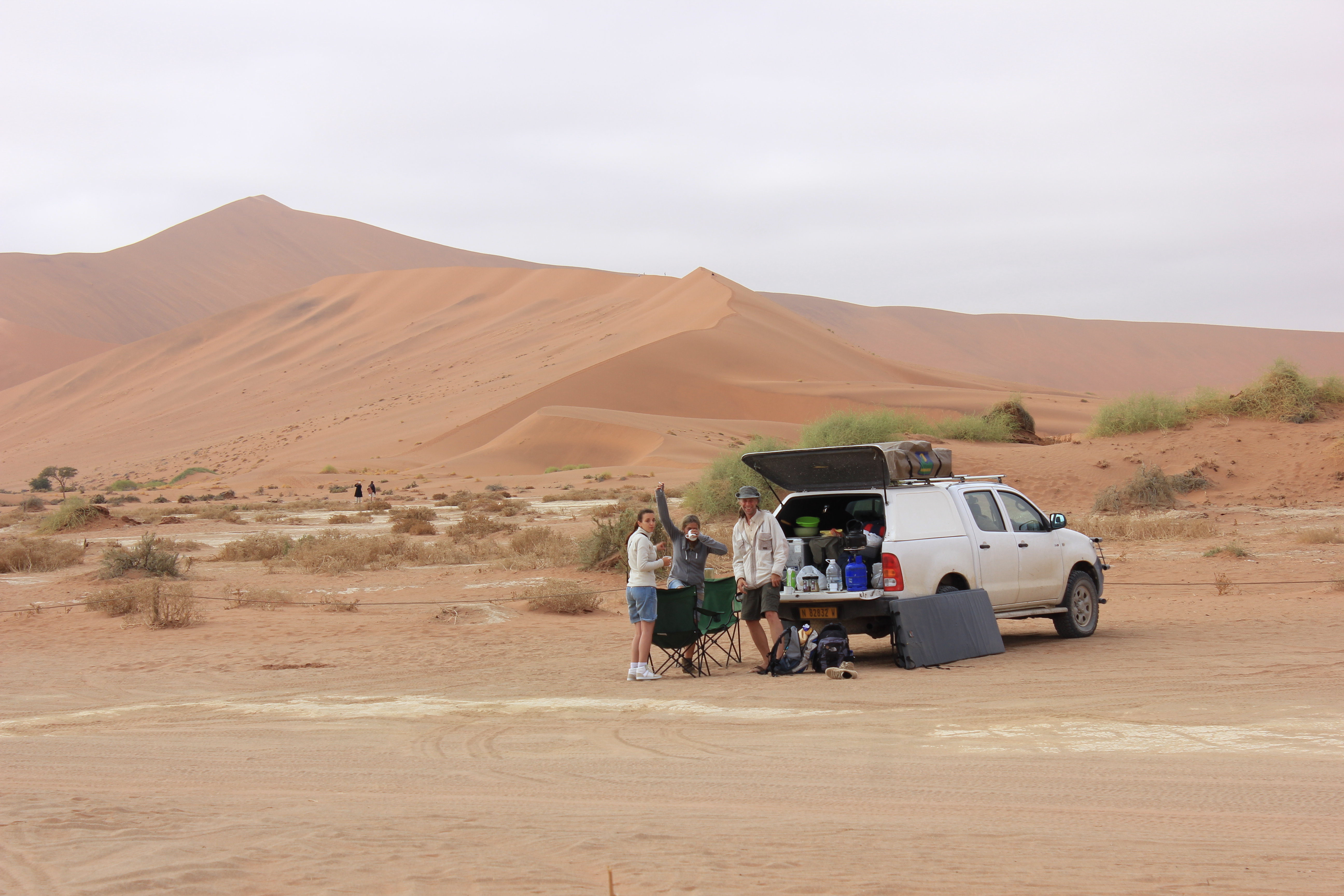 Nous rejoignons Marcus & Isabel à la voiture, pour prendre un bon café et quelques victuailles, afin de reprendre des forces. Nous croisons déjà les premiers groupes de touristes qui se rendent sur place, et c’est donc avec un malin plaisir que nous repensons à ce grand privilège que nous avons d’avoir pu profiter de tout ce spectacle seuls. Malheureusement cela marque aussi la fin de notre rencontre avec nos amis allemands, qui vont reprendre la route vers le Sud de la Namibie et continuer leur périple, tandis que nous restons dans les environs. Nous stoppons donc les voitures à hauteur de la dune 45, le temps de faire quelques dernières photos, de rigoler encore un peu, et voilà leur voiture qui s’éloigne déjà. De notre côté, nous sommes tentés pour l’ascension de la dune 45, mais il est déjà près de 10H, le ciel est désormais bien dégagé, et il fait donc déjà très chaud. Nous allons rester encore 2 nuits dans les environs de Sossuvlei, au Desert Homestead Lodge, et avons donc encore le temps de revenir demain pour une ascencion complète de la dune, dans de meilleures conditions.