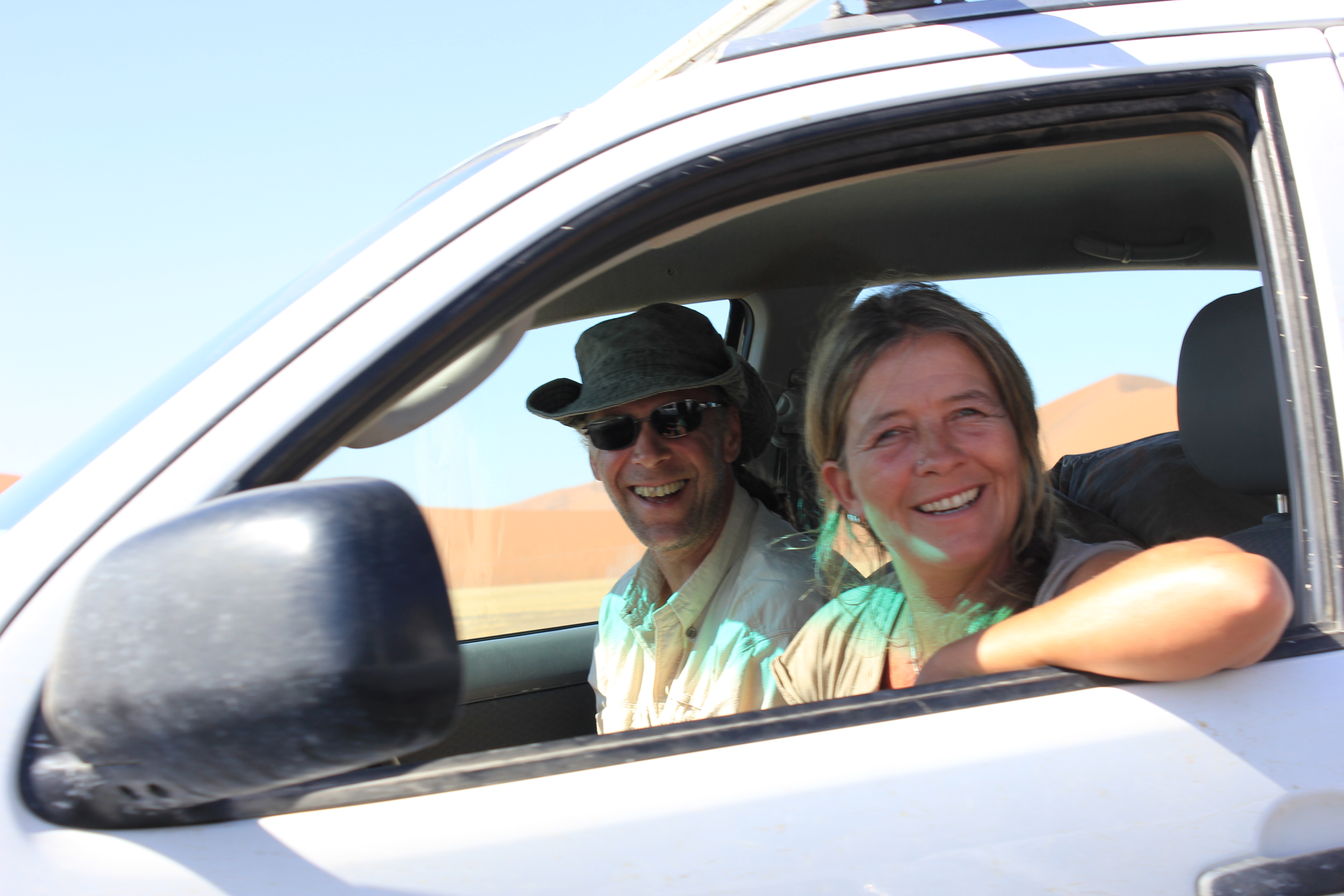 Tente repliée sur le toit, table et affaires rangées dans le coffre du 4×4, nous partons donc en même temps que Marcus & Isabel, et quittons le Sesriem Campsite à 5H30 tapantes. Nous sommes les premiers sur la route! Il faut dire qu’une fois de plus, même si nous sommes sur un site très touristique en Namibie, la période de l’année laisse pas mal d’emplacements vides, et donc de « concurrence » en moins pour accéder aux dunes. Les 60km qui séparent le camp de Sossusvlei s’effectuent sans problème sur route goudronnée, toutefois il faut faire preuve de vigilance avec les animaux susceptibles de traverser à cette heure avancée. Comme nous le prédisions hier au soir durant notre brai, le peu de voitures qui nous suivent s’arrêtent directement à la dune 45, nous laissant seuls avec la voiture de Marcus & ISabel devant nous. Déjà une pointe d’excitation se fait sentir, cela signifie donc que nous risquons d’être seuls pour la découverte de ce site unique! Les derniers kilomètres avant le site s’effectuant sur une piste très sablonneuse, nous abandonnons notre 4×4 pour monter avec nos amis allemands, qui sont rompus à la conduite dans ce type de condition. Les pneus dégonflés à environ 1.4bars, la voiture avance donc sûrement, et c’est sans difficulté que nous atteignons le dernier parking.