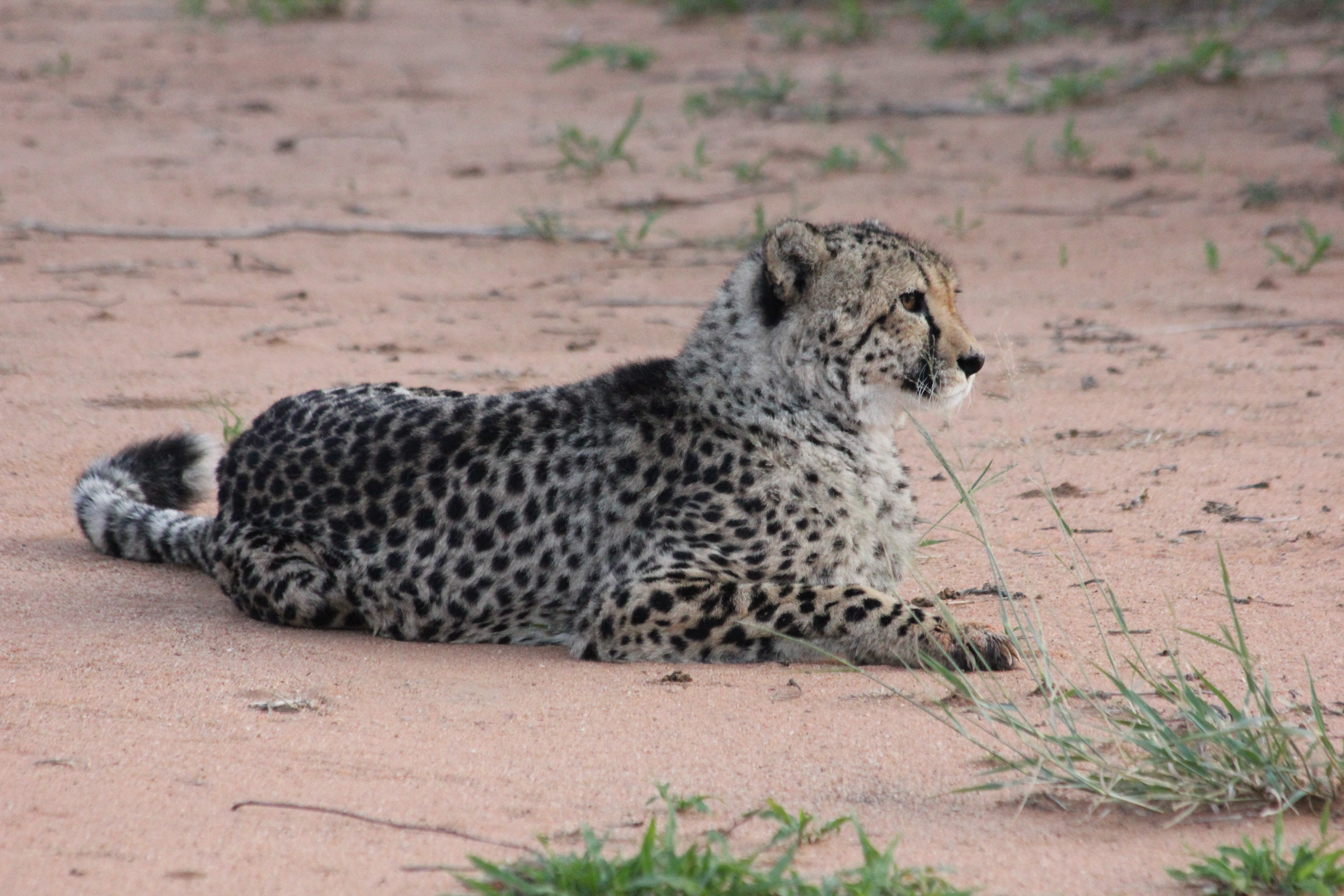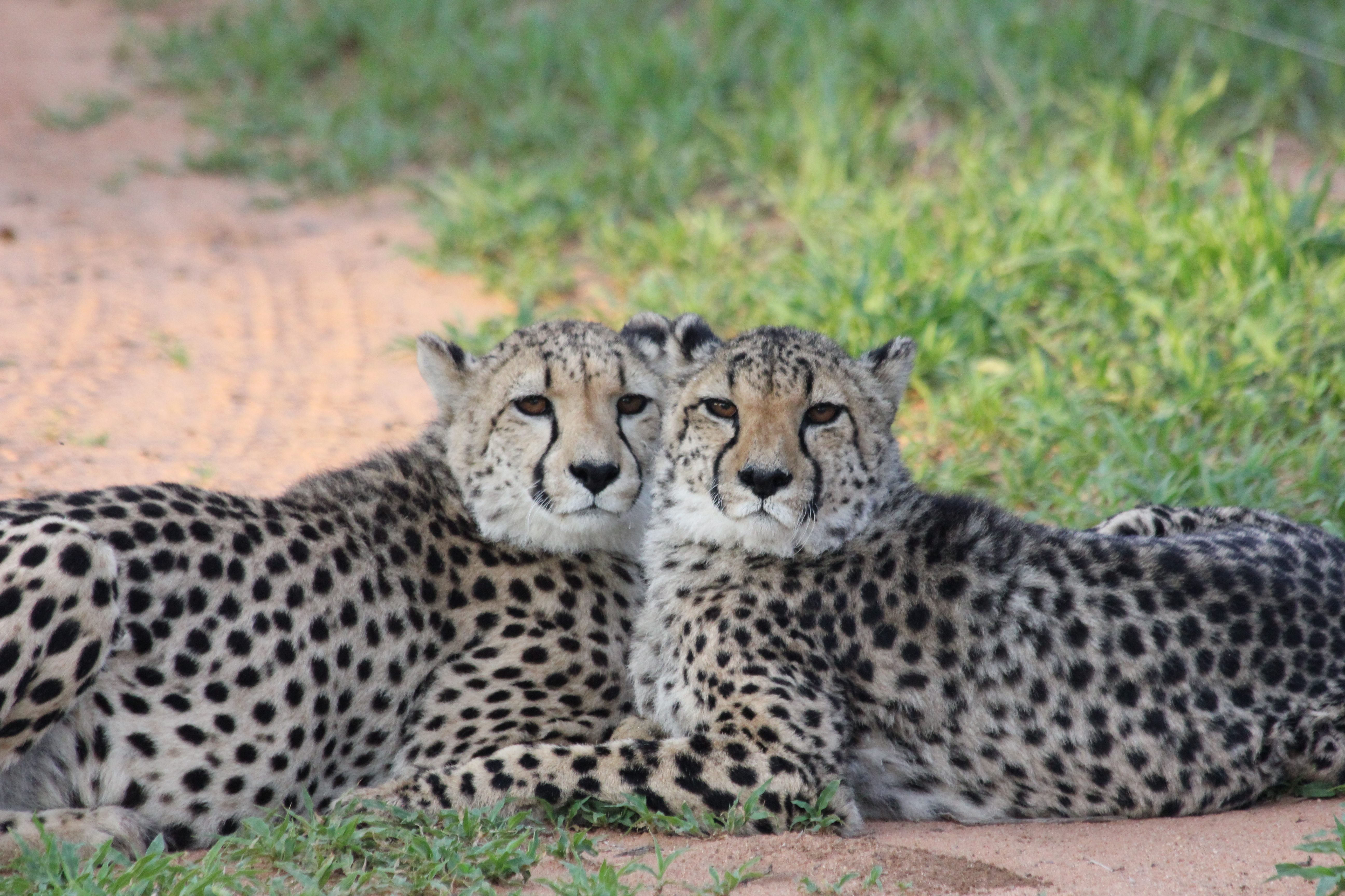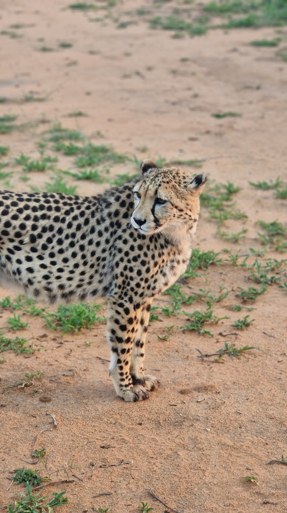 L’avantage de se lever si tôt, c’est de pouvoir admirer un ciel étoilé de toute beauté, il faut dire qu’avec le coup de stress de la veille nous n’avons pas forcément pris le temps de l’observer comme il se doit. On se prépare rapidement avec Nathalie ainsi que le petit déjeuner, beaucoup plus frugal que la veille il faut l’admettre, tartines de pâte à tartiner expédiées en 2 minutes, réchaud à gaz installé pour le café, on essaye de ne pas perdre trop de temps. Nous réveillons les enfants et leurs disons de s’installer dans la voiture pour finir la nuit, le temps pour nous de remballer les tentes et le matériel de camping. On a beau se dire qu’on s’en sort pas trop mal dans notre organisation, l’heure de quitter le campement arrive à vitesse grand V, il ne fallait pas louper le réveil. Nous levons le camp dans le bon timing, mais nous allons très vite avoir la réponse à l’une de nos deux question, à savoir qu’on se trompe allègrement dans la route pour rejoindre le point de rendez-vous, et on finit par chance par tomber sur le logement d’un autre guide, qui sortait de là au bon moment, et nous remettra sur de bons rails, et n’avoir finalement que 5-10min de retard. Le guide lui est bien là, en pleine forme, souriant comme jamais! Il s’en est finalement sorti quelques instants plus tard après que nous soyons partis hier, et a réussi à sortir le véhicule par lui-même. Je me demande encore comment il a pu faire, mais c’est une vraie prouesse à nos yeux, nous on imaginait le 4×4 laissé là toute la nuit pour être récupéré le lendemain, il faut croire que ce n’était absolument pas envisagé de son côté. Avec donc quelques minutes de retard nous décollons du point d’accueil, et nous mettons en route vers la fondation Africat. Avant d’aller découvrir les locaux dans lesquels sont soignés les animaux, nous roulons sur les terres du lodge en direction d’un vaste enclos, que nous longeons avant de nous positionner devant l’entrée. Une fois le sas franchi, nous ne tardons pas à apercevoir, à la lueur du soleil qui se lève, 5, puis 6 silhouettes se dessiner dans la végétation, et c’est là encore un moment ou le silence se fait sur nos sièges, malgré l’enthousiasme presque palpable que l’on ressent chez les garçons. Un groupe de 6 guépards se rapproche de nous, en toute tranquillité, presque comme si nous n’existions pas.