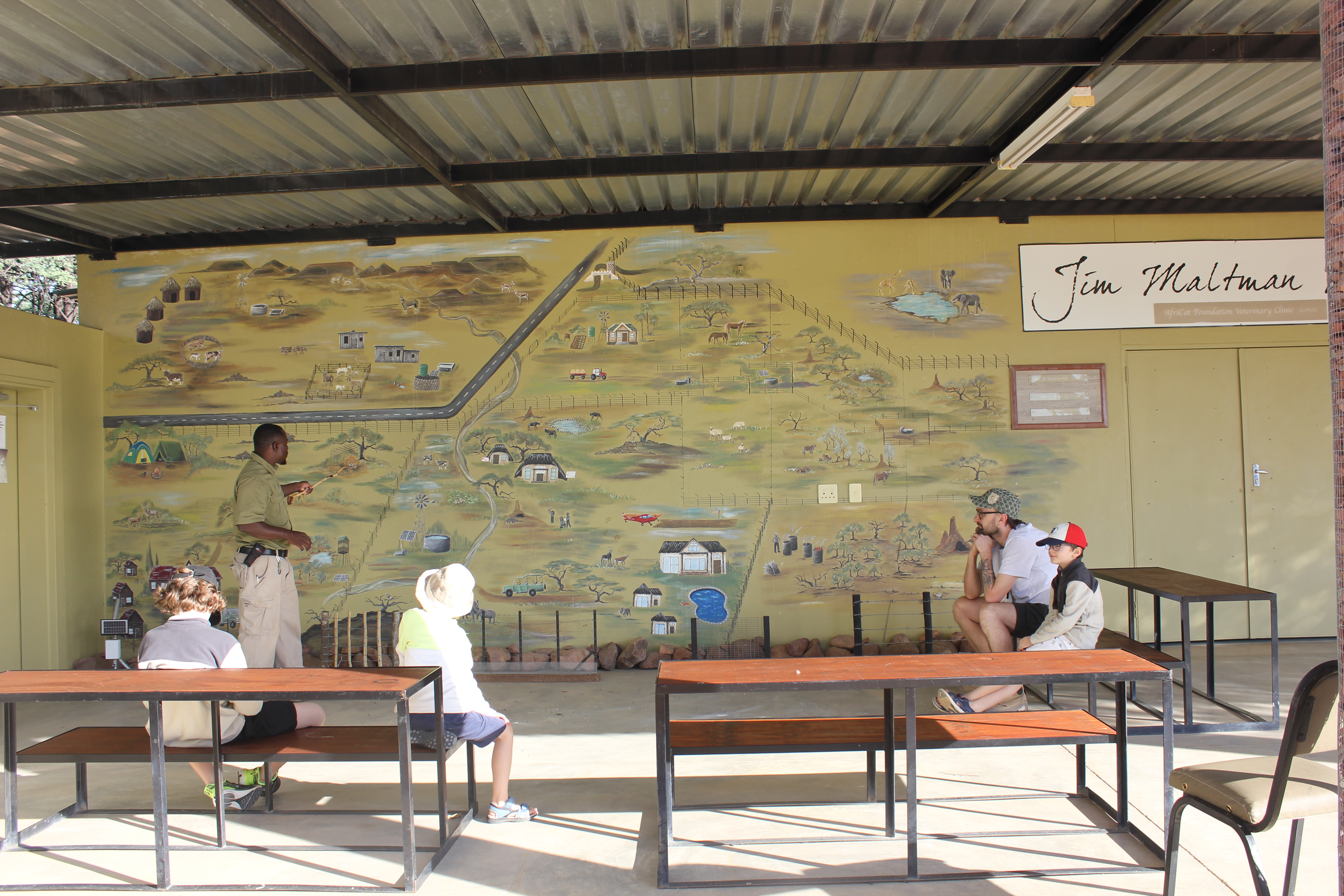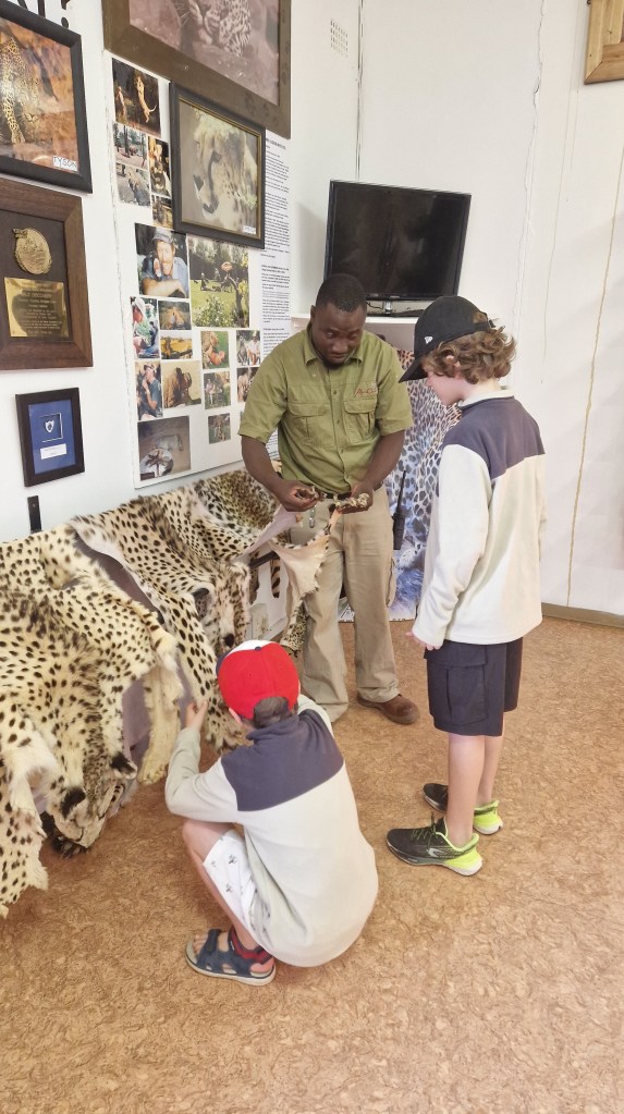 Nous sortons donc de l’enclos, afin de rejoindre ce qui était le premier centre de la fondation, aménagé aujourd’hui en salle de musée, dans laquelle vous pouvez retrouver une bonne partie de la faune environnante naturalisée, mais aussi des squelettes et peaux d’animaux, qui viennent agrémenter les explications sur tous les projets qui ont été menés jusque là, les adaptations faites au fil du temps pour répondre au mieux au respect de la vie sauvage, et optimiser les soins prodigués aux félins recueillis à Okonjima. La visite a le mérite d’être très intéressante, mais les enfants semblent fatigués par ce réveil matinal, et commencent à être moins concentrés. Nous tentons de traduire les paroles de notre guide, mais nous sentons bien que leurs esprits ne sont pas tout à fait concentrés là-dessus, normal vous me direz. La visite s’écrème donc pour ne laisser que l’essentiel, et se termine je pense un peu plus tôt que ce qui est normalement prévu, afin de pouvoir passer à autre chose. Nous retournons à l’accueil du lodge pour prendre un dernier café, faire un petit tour à la boutique, puis décidons de reprendre la route. Au final, à notre étonnement, il n’est vraiment pas tard, autour de 9H30, c’est plutôt une bonne chose, il y a un peu de route à avaler afin de rejoindre notre prochaine étape. Ce temps passé à Okonjima aura été à la fois gourmand et optimisé à souhait, mais aussi passé trop rapidement. Difficile de réaliser pleinement qu’en l’espace de 24H nous ayons pu vivre tant de belles émotions. Nous quittons néanmoins Okonjima le sourire aux lèvres, comme nous l’espérions cette « mise en bouche » sur tout ce qui est au devant de nous a tenu ses promesses.