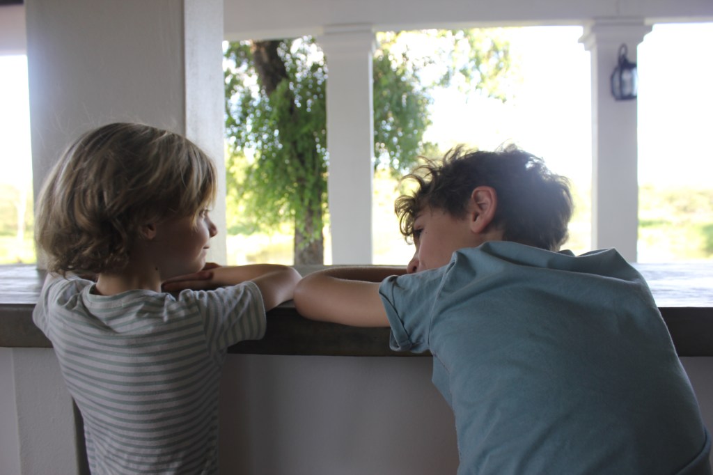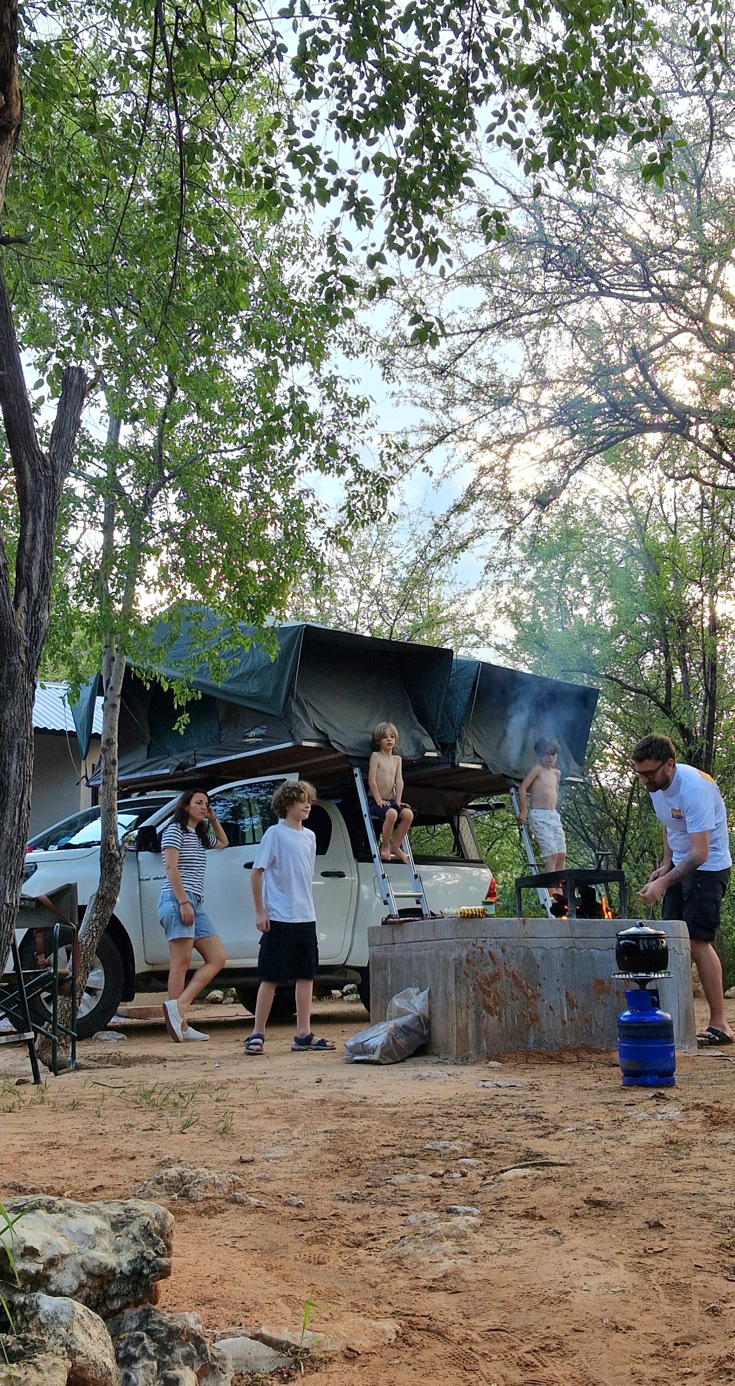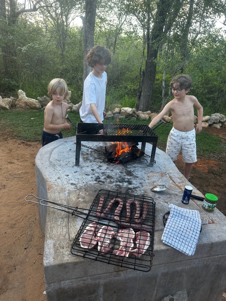 L’après-midi se passe donc entre la piscine, le bar de la piscine, et notre campement, que nous installons sans difficulté. Ce coup-ci, pas de surprise, on sera bien là avant la tombée de la nuit, alors on sort le grand jeu! Apéro + braai! Nous passons un très bon moment à jouer aux cartes, l’ambiance est vraiment bonne, détendue. Les oiseaux chantent autour de nous, et n’hésitent pas à s’approcher de nous pour glaner quelques miettes, pour le plaisir de tous. Torses nus, les garçons s’éclatent autour des quelques flammes qui crépitent sur le braai, c’est très plaisant de les regarder être soudés entre eux et s’éclater simplement. Il n’y a pas plus de 72H de cela, ils étaient de vrais petits citadins, avec un rythme de vie bien rodé et organisé, et les voilà maintenant premier adjoint cuisson de saucisse, assistant en chef brochette, et responsable du service de l’apéro. Bref, ils sont heureux, et ça, c’est très réconfortant 🙂