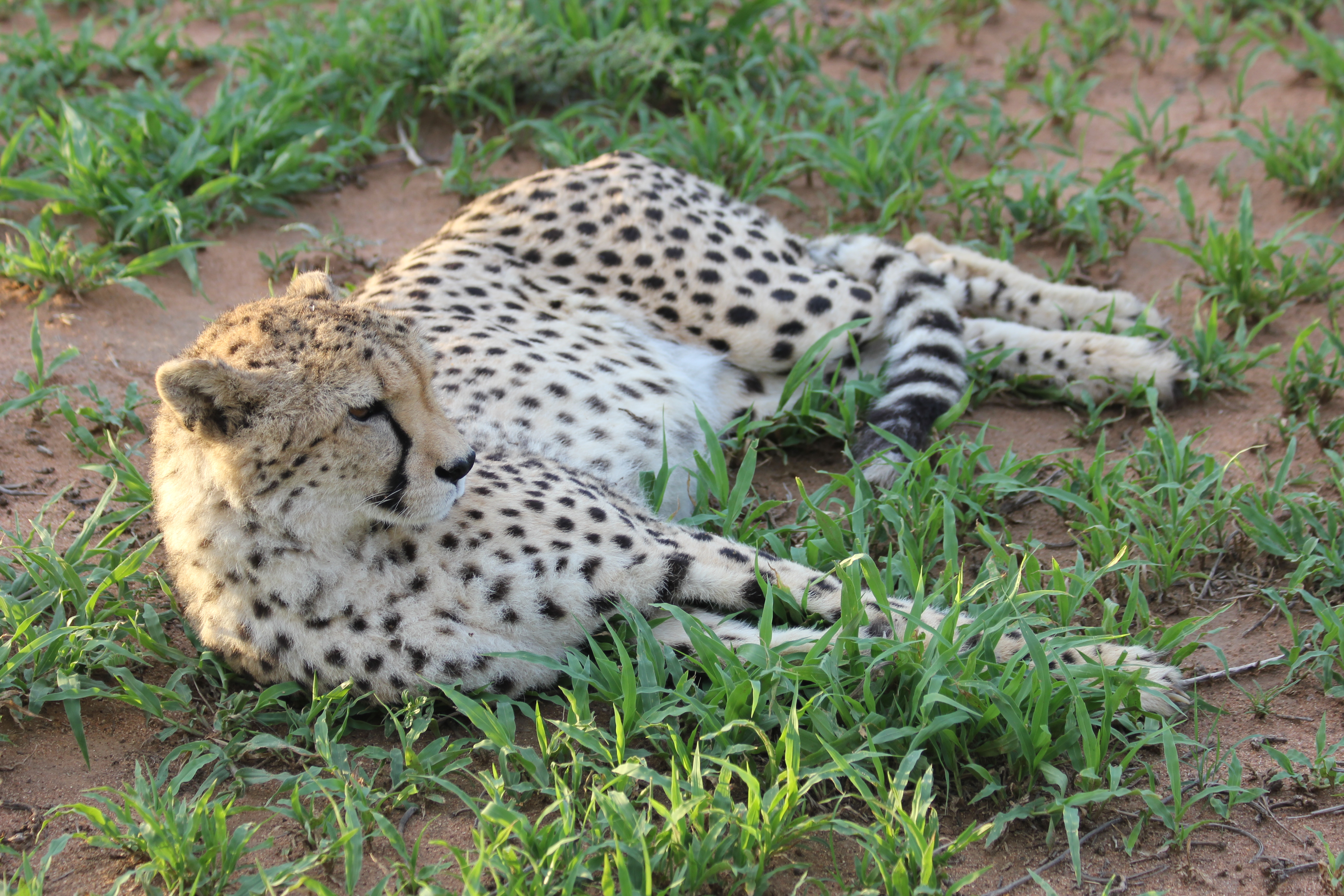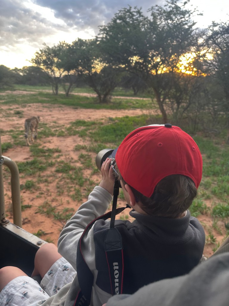 Et pourtant, aux sons des « wow » de Jacob, « Schau mal Mama » de Léon, difficile de passer inaperçu! Certes, nous sommes dans un enclos, un endroit fermé et donc limitant les mouvements des animaux, c’est un paramètre que l’on ne peut ignorer en faisant cette visite, mais se retrouver si proche d’un tel animal, pouvoir l’observer communiquer avec ses semblables, relève d’un privilège immense. Ces animaux seraient probablement livrés à leur triste sort s’ils n’étaient pas soignés et entretenus par la fondation Africat, il faut donc relativiser les conditions dans lesquelles les animaux sont maintenus, qui semblent tout à fait adaptées. Les guépards vont et viennent autour de notre véhicule, Matisse semble absorbé par le spectacle qui se déroule à quelques mètres de lui. Pas besoin de jumelle ici, nous pourrions presque entendre leur souffle tellement ils semblent proches. On ne peut se remettre de ce genre de rencontre, qui force le respect. Tout le monde y va de sa petite photo, essaye d’immortaliser cet instant précieux, afin d’agrémenter nos souvenirs une fois revenus de voyage. Le soleil offre des rais de lumière tout à fait splendides en se levant, se mêlant si bien avec la terre ocre et la végétation verdoyante. Nous sommes à l’intérieur d’une toile d’artiste, observateurs privilégiés des félins parmi les plus beaux que la Terre compte. Pas de démonstration de vitesse malheureusement, ce qui laisse tout même la possibilité à Léon d’imaginer qu’il pourrait faire la course avec eux, et pourquoi pas gagner… On sait jamais, vous savez, un malentendu… Lui qui est un sportif dans l’âme, refusant la défaite et jouant la gagne à chaque départ, le fait d’observer l’animal terrestre le plus rapide du monde est une opportunité unique. Le Guinness Book version grandeur nature, imaginez un peu! Au lieu de course, nous observons des papouilles, des moments ou les animaux sont très proches entre eux, ce qui les rend irrésistibles. Toutefois, il faut se faire une raison et les laisser seuls poursuivre leur petite routine quotidienne, la découverte de la fondation Africat n’est pas encore terminée.