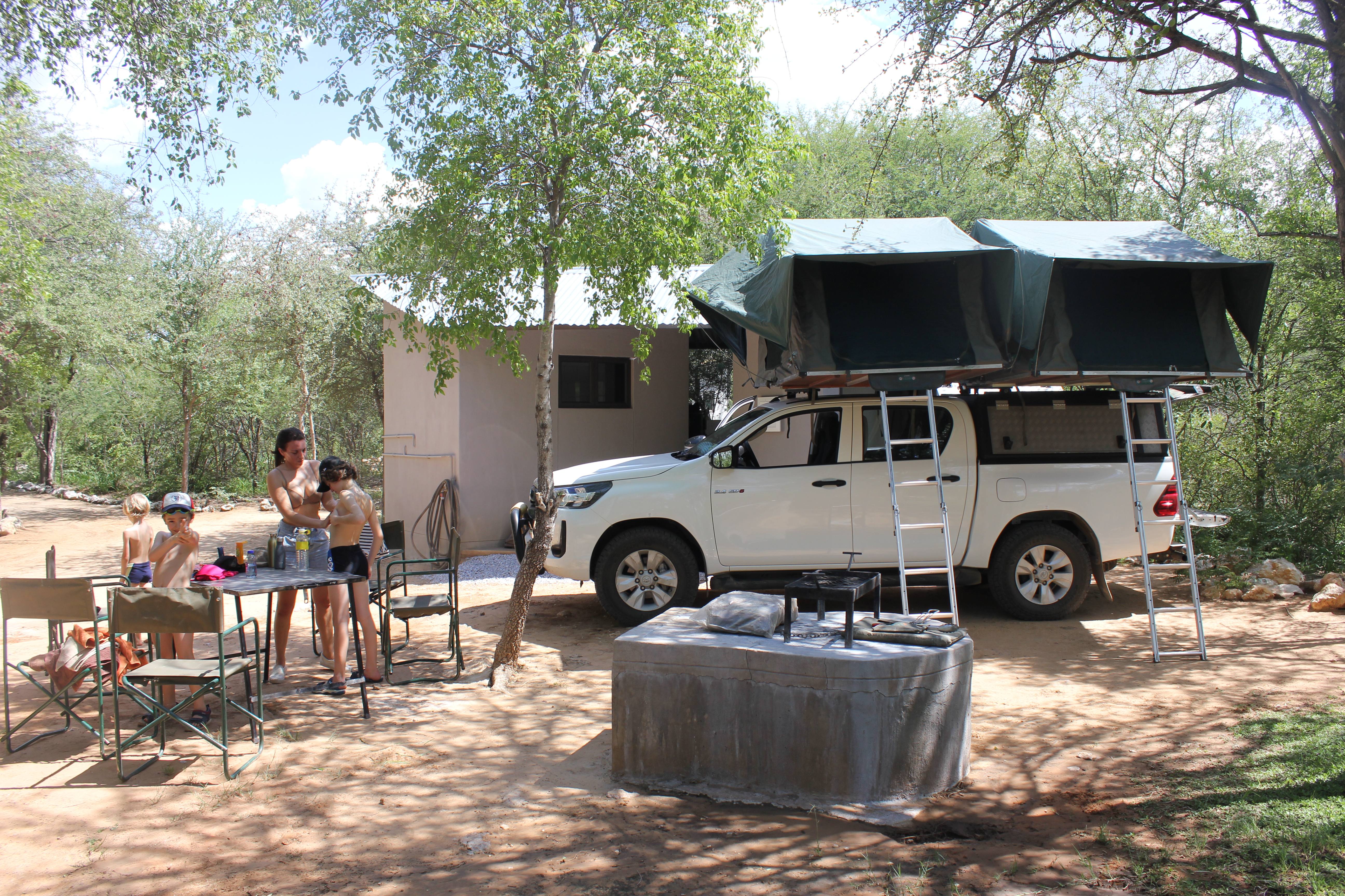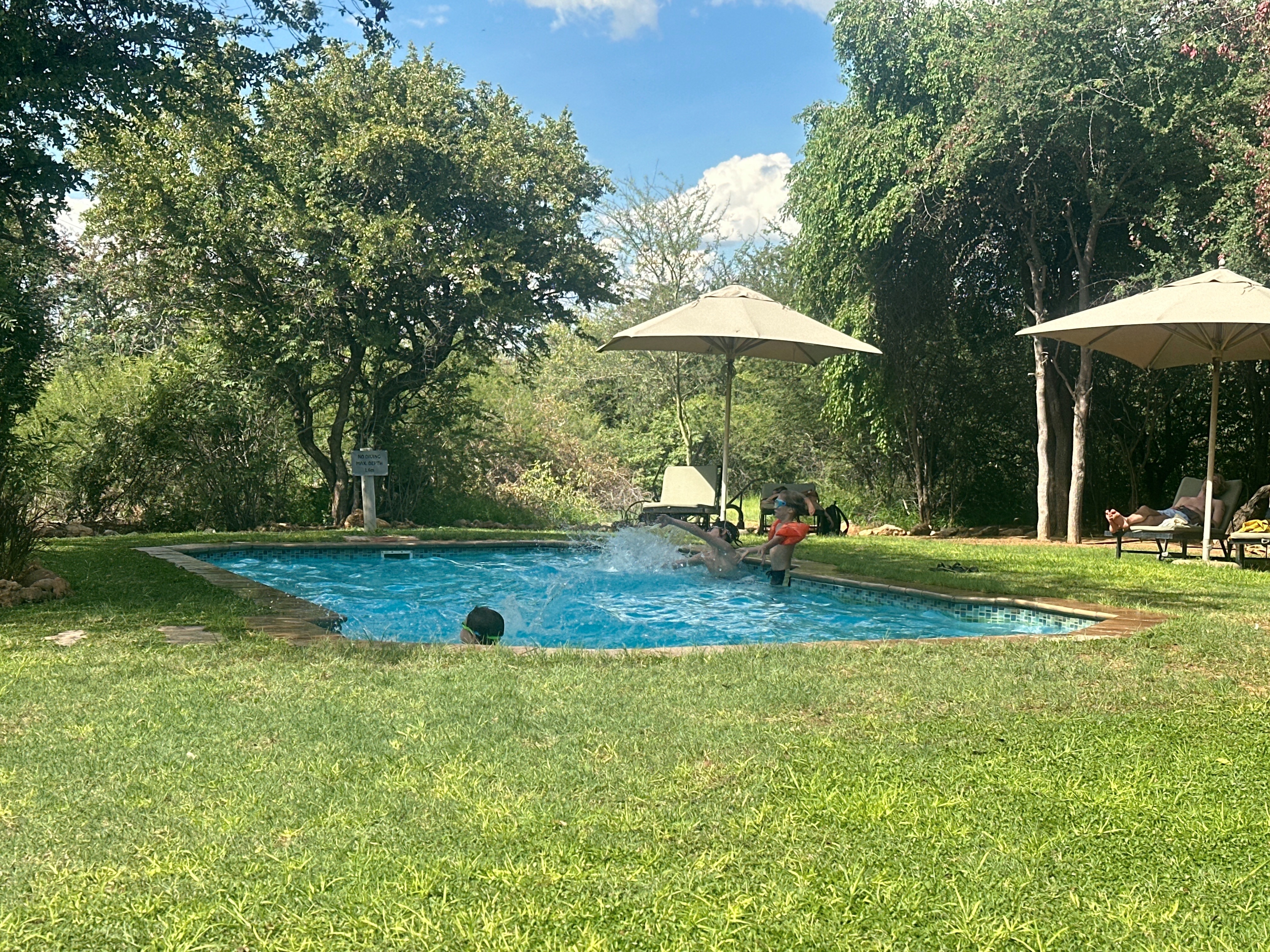 Nous arrivons à Onguma vers 14H30, et s’il y a bien une chose que les enfants repèrent directement, avant même d’être garés, c’est la piscine! Et oui, surprise les garçons, on va pouvoir se détendre un peu! Nous effectuons les formalités d’arrivée, et allons nous installer avec Luffy sur l’emplacement qui nous est réservé. Bien ombragé, équipé d’un espace privé pour la douche, les WC, et la vaisselle, l’emplacement est très beau! C’est vraiment une bonne surprise pour nous, il n’y a rien à redire! La piscine est à 50m à tout casser, le temps de déballer les maillots, sortir chaises et table, et le tour est joué, tout le monde en sandales avec la serviette sous le bras! Située dans un bel écrin de verdure, il y a quelques transats autour, plus ou moins occupés par d’autres touristes. Forcément, quand on débarque avec notre petite clique, on ne passe pas inaperçus, l’euphorie est presque palpable chez les enfants, que nous tentons tant bien que mal de calmer pour ne pas trop mettre le boxon. Mais vous le voyez venir, c’est mission impossible, et cela peut se comprendre, ils viennent de s’enchaîner un bon bout de trajet, il est temps de se défouler un peu! Onguma propose des drive au départ du camp, nous avions noté cette possibilité dans notre carnet de voyage, mais nous préférons laisser les enfants à la piscine, pour ne pas trop charger la journée.
