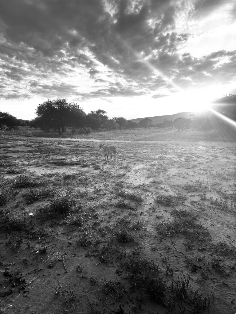 C’est encore un peu embués par les émotions vécues la veille que nous nous réveillons très tôt ce matin, il faut dire que nous sommes attendus à 5H45 dans le hall d’accueil d’Okonjima pour retrouver notre guide de la veille, pour faire découvrir la fondation Africat aux garçons, son fonctionnement et ses objectifs, et pouvoir également observés un autre grand félin bien connu de la Namibie, à savoir le guépard. Mais avant de pouvoir parler de quoique ce soit, nous avons 2 questions qui nous sautent à l’esprit dès le réveil: Notre guide sera-t’il en forme, après avoir probablement galéré une partie de la soirée/nuit à sortir son véhicule ensablé, et surtout, arrivons-nous à retrouver le chemin menant jusqu’à l’accueil pour le retrouver, sachant qu’il fait encore nuit noire.